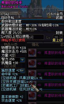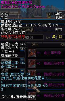 Lv55以上可以使用 物理攻击力:+400 魔法攻击力:+453 力量:+43 抗魔值:+38 物理暴击+3% 命中率+1% 物理、魔法伤害增加5% [弹药主宰]技能射程 +5% [弹药主宰]的附加发射几率 +10%