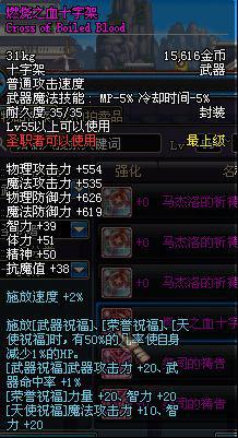 Lv55以上可以使用 物理攻击532+ 魔法攻击592+ 智力60+ 力量41+ 攻击时,有5%的几率发出血十字。 攻击时,有1%的几率回复2%HP和MP。