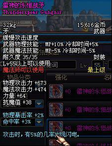Lv55以上可以使用 物理攻击640+ 魔法攻击480+ 力量44+ 攻击速度+3% 近战攻击+20%